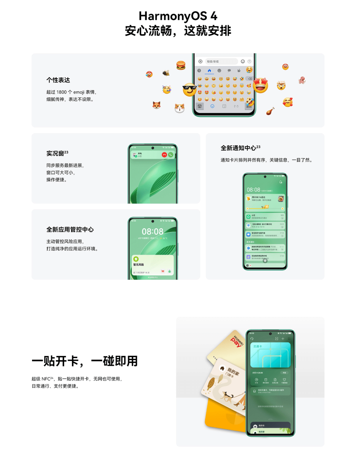 华为nova 11 SE还搭载了4500mAh超大电池,支持66W华为超级快充Turbo 2.0,能带来流畅持久的续航表现以及快速(32分钟即可充满)稳定的充电体验。此外,华为nova 11 SE内置的超级NFC,能够模拟银行卡、门禁卡、交通卡、校园卡等众多实体卡片,出门再也不用携带各种卡包了。