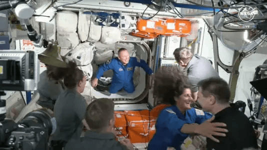 在到达目的地后,两名宇航员 ——58 岁的威尔莫尔和 61 岁的威廉姆斯花了大约两个小时进行了一系列标准程序,如检查气闸是否泄漏、为太空舱和国际空间站之间的通道加压,然后打开舱门。